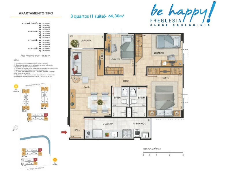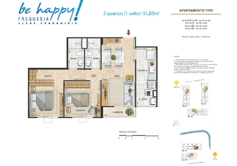 Apartamentos de 2 quartos com suíte de 53m² a 58m²;